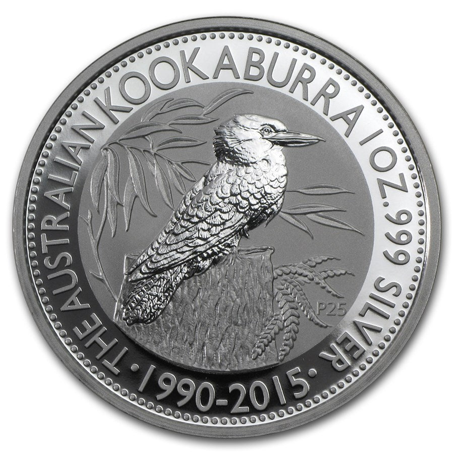 The Australian Silver Kookaburra series, issued by the Perth Mint since 1990, is one of the most popular world bullion coins thanks to its annually changing designs. The 2015 release marks the series’ 25th Anniversary and features a special design of two kookaburras perched on a fence post, along with a commemorative “25 Years” mintmark.
