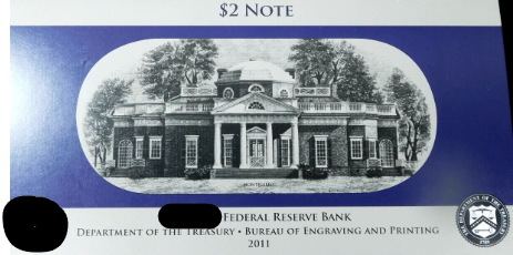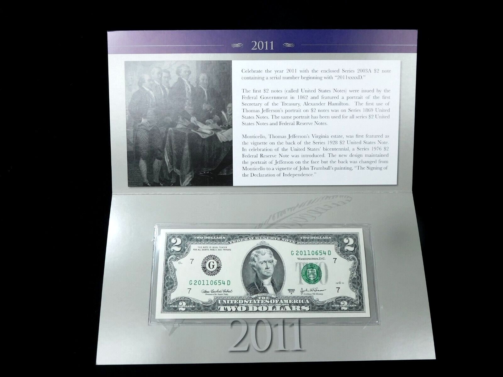 This $2 note, issued in 2003-A by the Bureau of Engraving and Printing (L-San Francisco), comes in uncirculated condition. It is showcased in an official BEP display, and features a unique serial number beginning with 2011*, making it a standout addition for any collector.