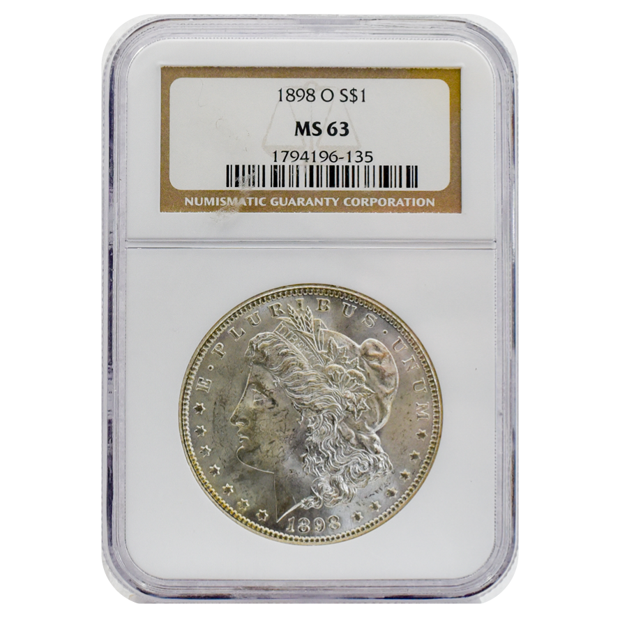 The 1898-O Morgan Dollar graded MS63 by NGC is a bright, uncirculated coin with bold luster, a decent strike, and moderate contact marks consistent with the grade. Struck at the New Orleans Mint, this issue is known for variable strike quality, but this example offers solid detail and strong eye appeal. It’s a popular choice for collectors seeking an attractive Mint State coin from a southern branch mint with historical charm.