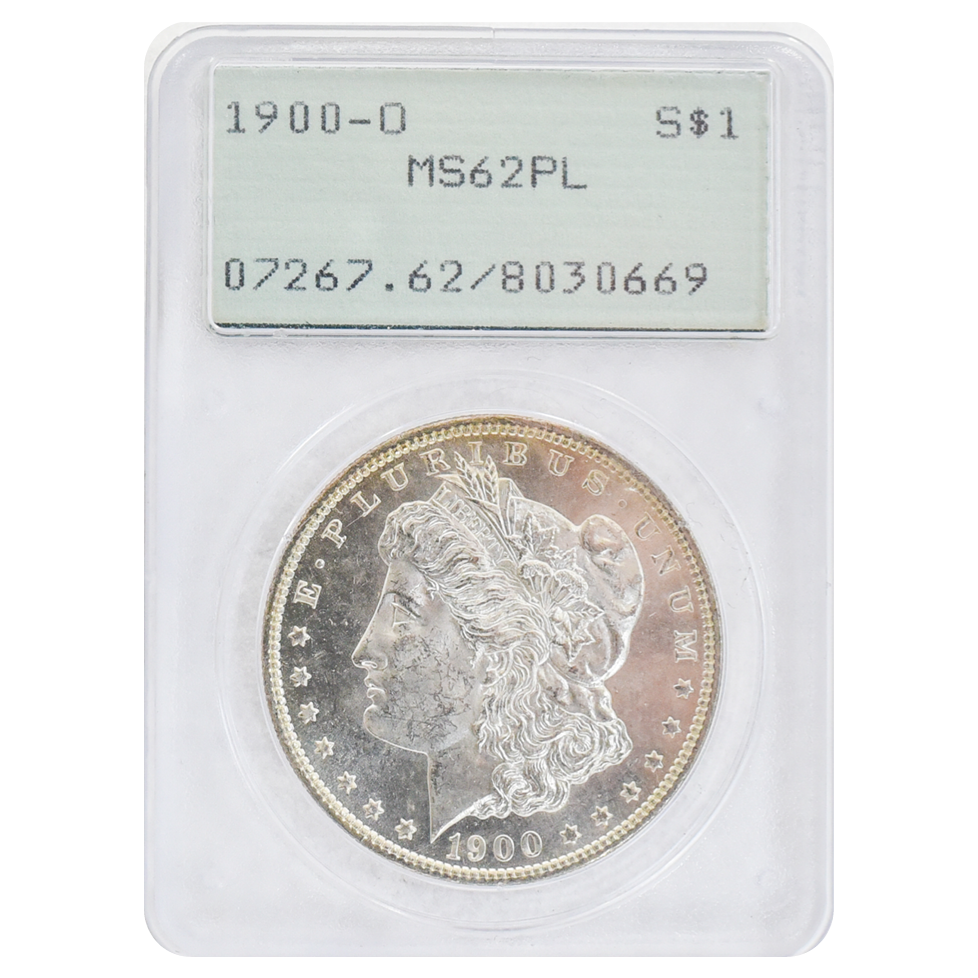 The 1900-O Morgan Dollar graded MS62PL by PCGS features Prooflike surfaces, with mirrored fields and frosted devices that create a striking cameo effect. Despite moderate contact marks typical of the MS62 grade, the coin’s reflective qualities and decent strike enhance its visual appeal. As a Prooflike (PL) example from the New Orleans Mint, it offers collectors an attractive and somewhat scarcer variant of a classic silver dollar.